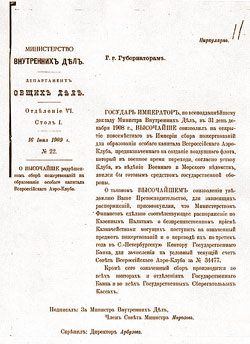 | Циркуляр Министерства Внутренних Дел губернаторам «О Высочайше разрешенном сборе пожертвований на образование особого капитала Всероссийского Аэро-Клуба». 16 июня 1909 г. Публикуется впервые. |