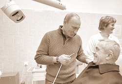 Осуществив в белгородской поликлинике профилактику и диагностику, премьер-министр Путин оглянулся по сторонам. Сзади метнулась женская тень настоящего стоматолога. Путину подсунули букет, и он поздравил стоматолога с днем рождения. Зубы заговаривать он научился.