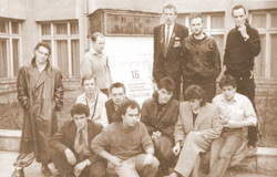 | Группа «АукцЫон», апрель 1988 г. Третий справа в нижнем ряду Евгений Дятлов. Фото из архива Д. Озерского. |